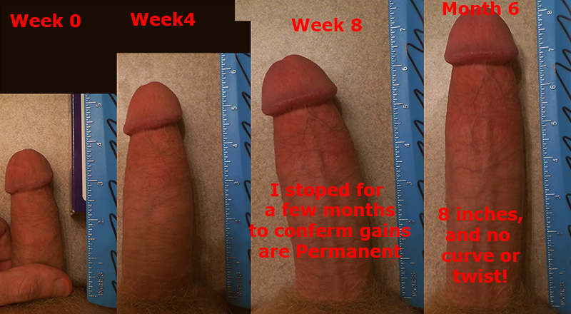 the stage where I can actually brag about the size of my penis! I did notice that as I used ThePenisProfessor I had to change up my work out every week or so or my growth would slow a bit. You can see my main gains the first month came in Length, the second Month I focused on Girth, and then I took a break to see if this was in fact permanent. Some time later in month 6 I resumed using the penis professor and grew my self out to about 8 inches!